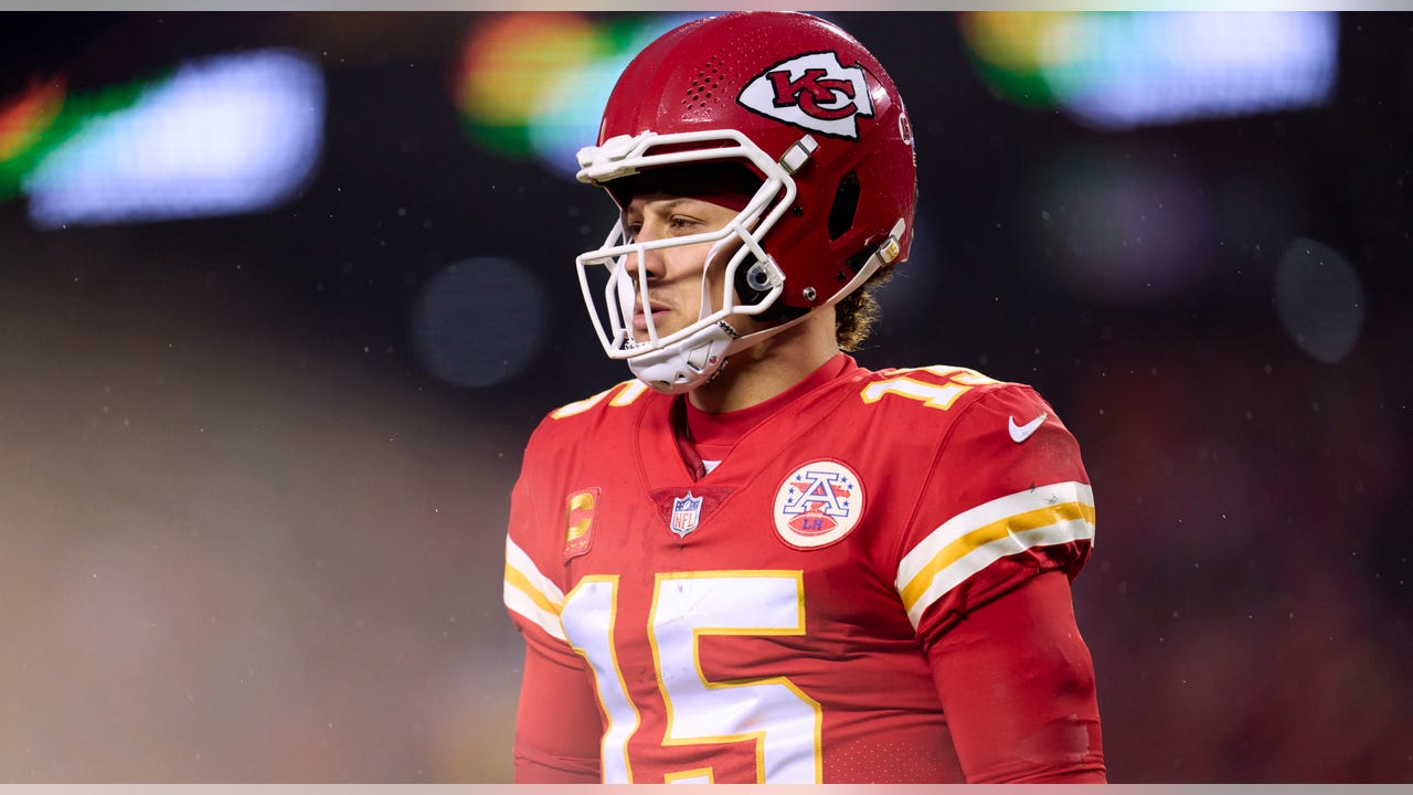 Patrick Mahomes of the Chiefs looks toward the sideline during the Jacksonville Jaguars game at Arrowhead Stadium on Jan. 21, 2023. (Cooper Neill/Getty Images)
