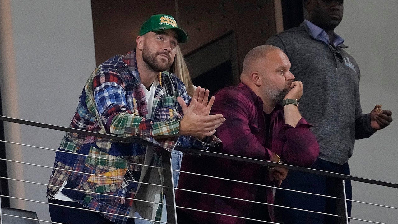 Travis Kelce of the Kansas City Chiefs attends Game 1 of the World Series between the Arizona Diamondbacks and the Texas Rangers at Globe Life Field on October 27, 2023, in Arlington, Texas. (Sam Hodde/Getty Images)