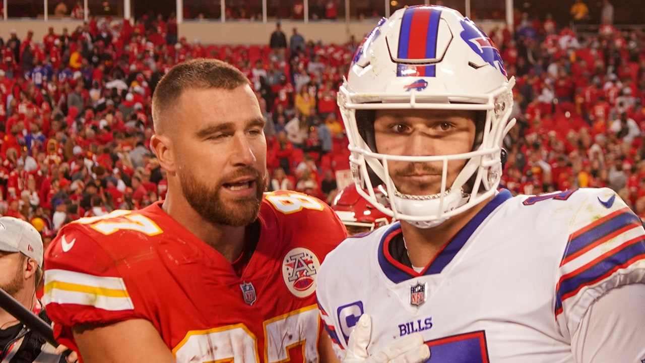 Chiefs tight end Travis Kelce talks with Buffalo Bills quarterback Josh Allen after the game at GEHA Field at Arrowhead Stadium in Kansas City, Oct. 16, 2022. (Denny Medley-USA Today Sports)