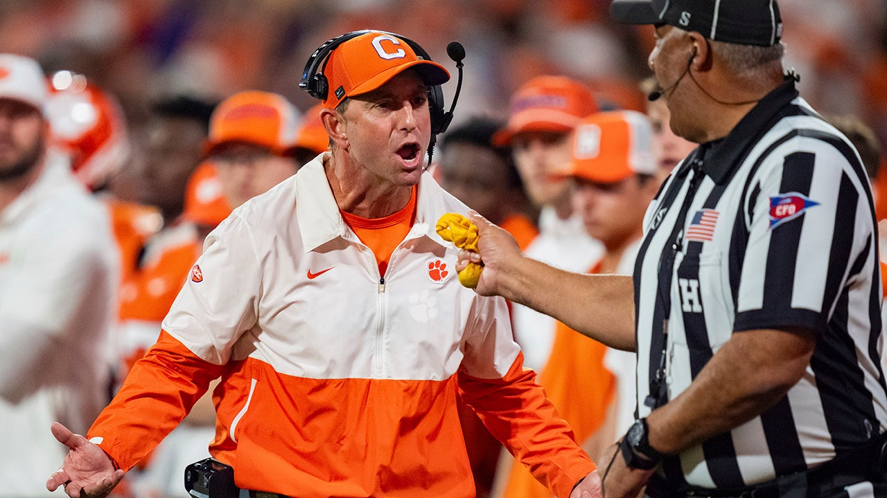 Clemson head coach Dabo Swinney reacts in the first half of an NCAA college football game against Louisville, Saturday, Nov. 2, 2024, in Clemson, S.C. (Jacob Kupferman/Associated Press)