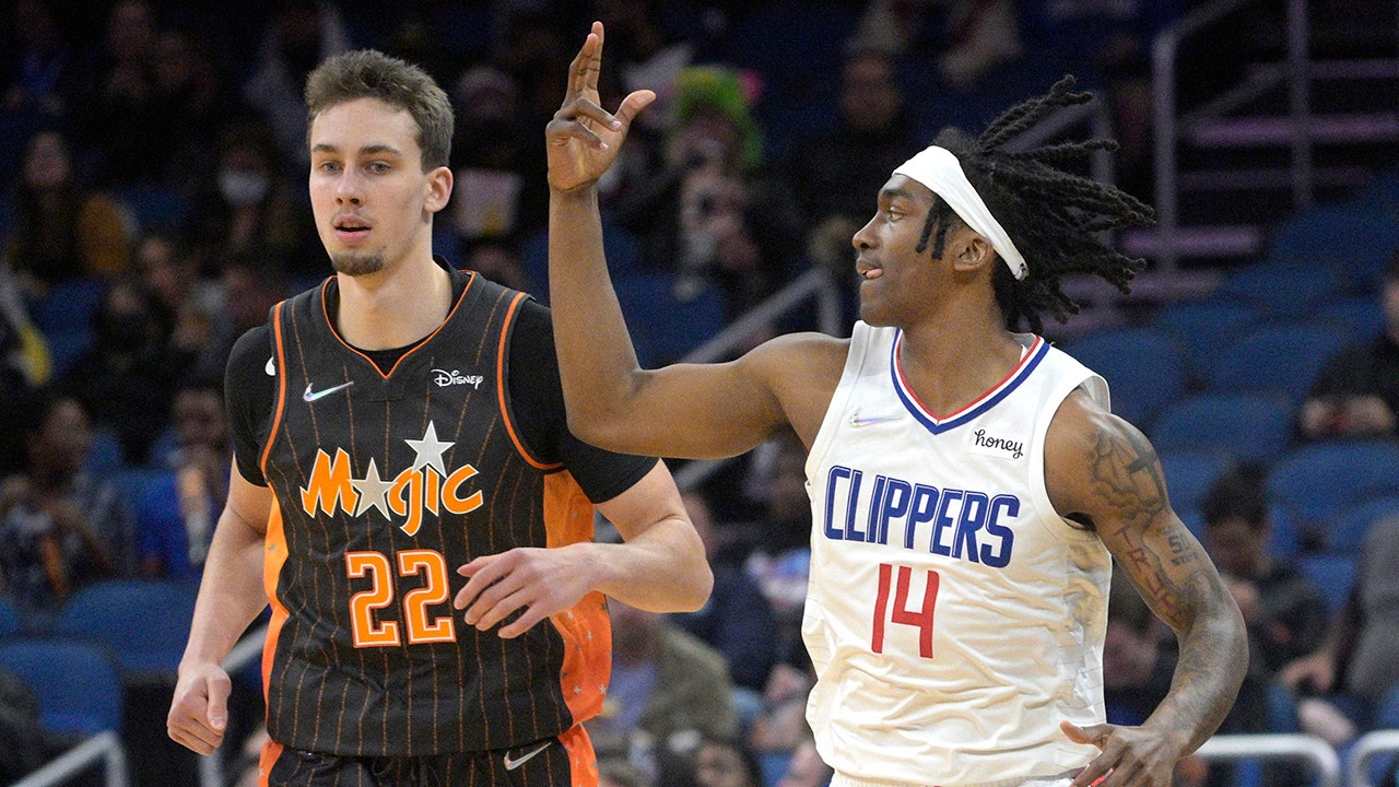 Los Angeles Clippers guard Terance Mann (14) celebrates after scoring a 3-pointer in front of Orlando Magic forward Franz Wagner (22) during the first half of an NBA basketball game, Wednesday, Jan. 26, 2022, in Orlando, Fla. (AP Photo/Phelan M. Ebenhack)