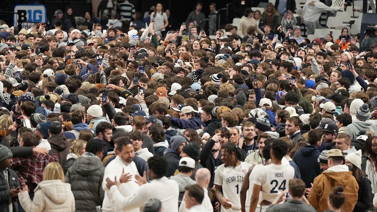 Penn State Nittany Lions fans storm the court after winning a college basketball game against the Wisconsin Badgers at the Bryce Joyce Center Jan. 16, 2024, in University Park, Pa. (Mitchell Layton/Getty Images)