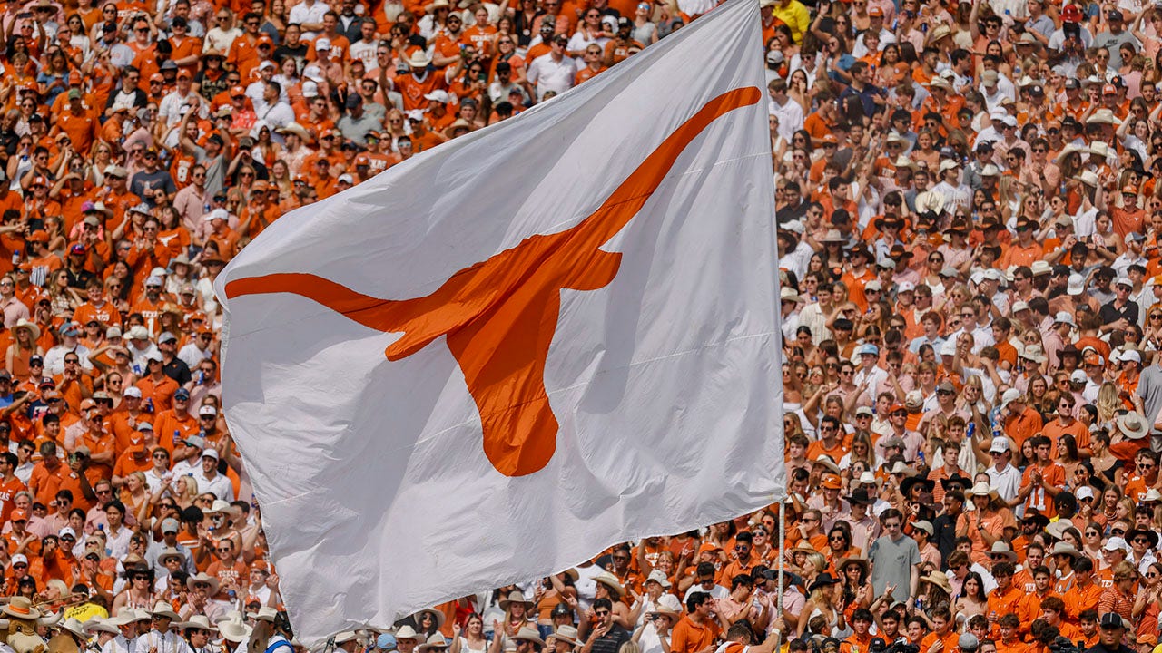 The Texas Longhorns flag flies after a touchdown during a game between Texas and the Oklahoma Sooners Oct. 8, 2022, at the Cotton Bowl in Dallas. (Matthew Pearce/Icon Sportswire via Getty Images)