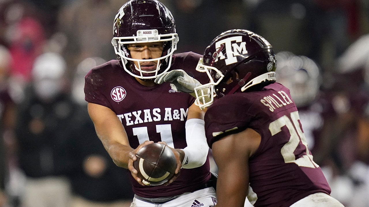 Texas A&M quarterback Kellen Mond (11) hands the ball off to running back Isaiah Spiller (28) during the fourth quarter of an NCAA college football game against LSU, Saturday, Nov. 28, 2020, in College Station, Texas. (AP Photo/Sam Craft)