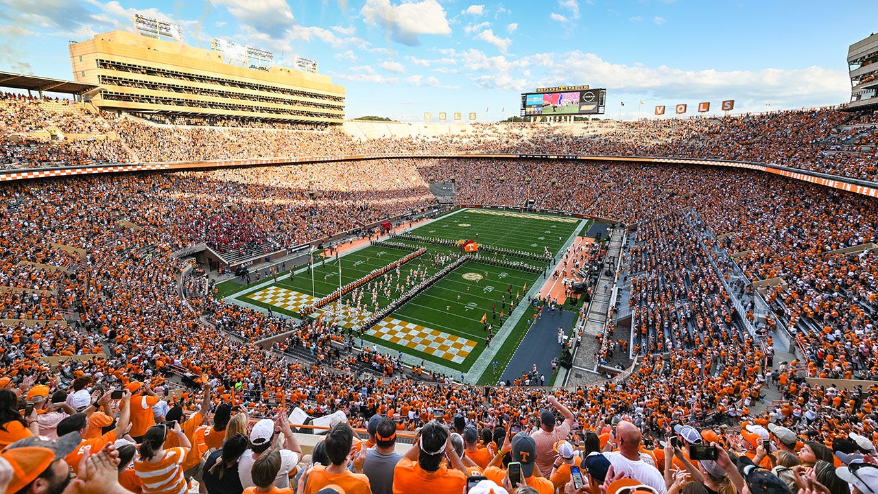 Tennessee Volunteers run through the Power T formation before the college football game between the Tennessee Volunteers and Ball State Cardinals on Sept. 1, 2022, at Neyland Stadium, in Knoxville, TN. (Photo by Bryan Lynn/Icon Sportswire via Getty Images)