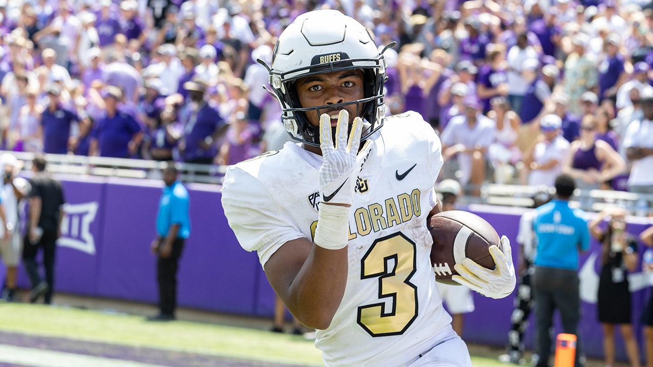 Colorado Buffaloes running back Dylan Edwards celebrates after scoring a touchdown against the TCU Horned Frogs on Sept. 2, 2023, at Amon G. Carter Stadium in Fort Worth, Texas. (Matthew Visinsky/Icon Sportswire via Getty Images)