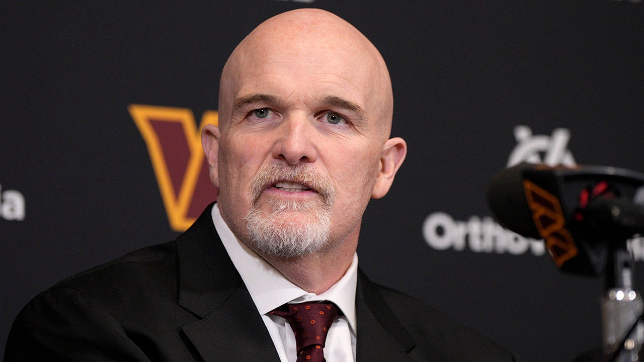 Head coach Dan Quinn of the Washington Commanders speaks during a press conference at OrthoVirginia Training Center at Commanders Park Feb. 5, 2024, in Ashburn, Va. (Jess Rapfogel/Getty Images)