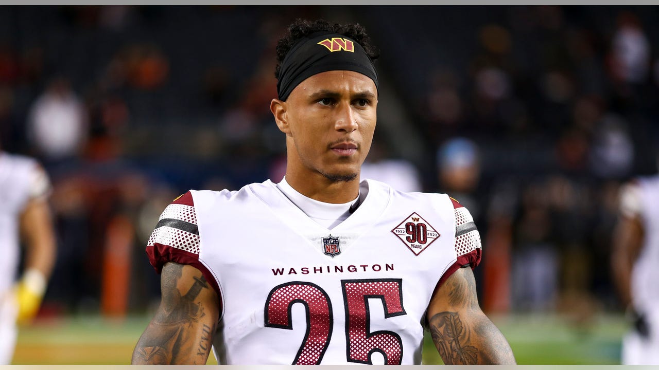 Benjamin St-Juste of the Washington Commanders before the Chicago Bears game at Soldier Field on Oct. 13, 2022, in Chicago. (Kevin Sabitus/Getty Images)
