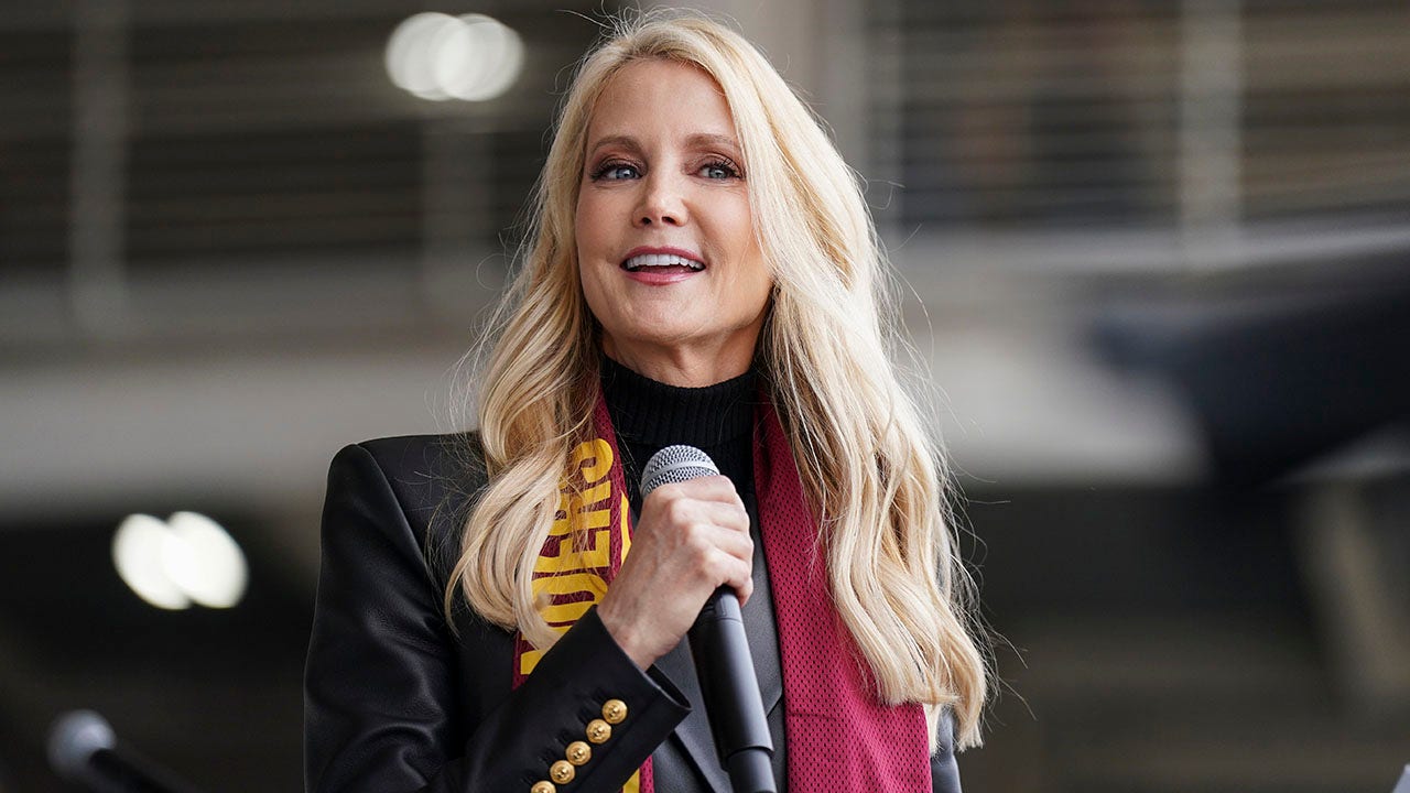 Tanya Snyder, Washington Commanders co-owner and co-CEO, speaks before an NFL football game between the Washington Commanders and the Green Bay Packers, Sunday, Oct. 23, 2022, in Landover, Maryland. (AP Photo/Al Drago)