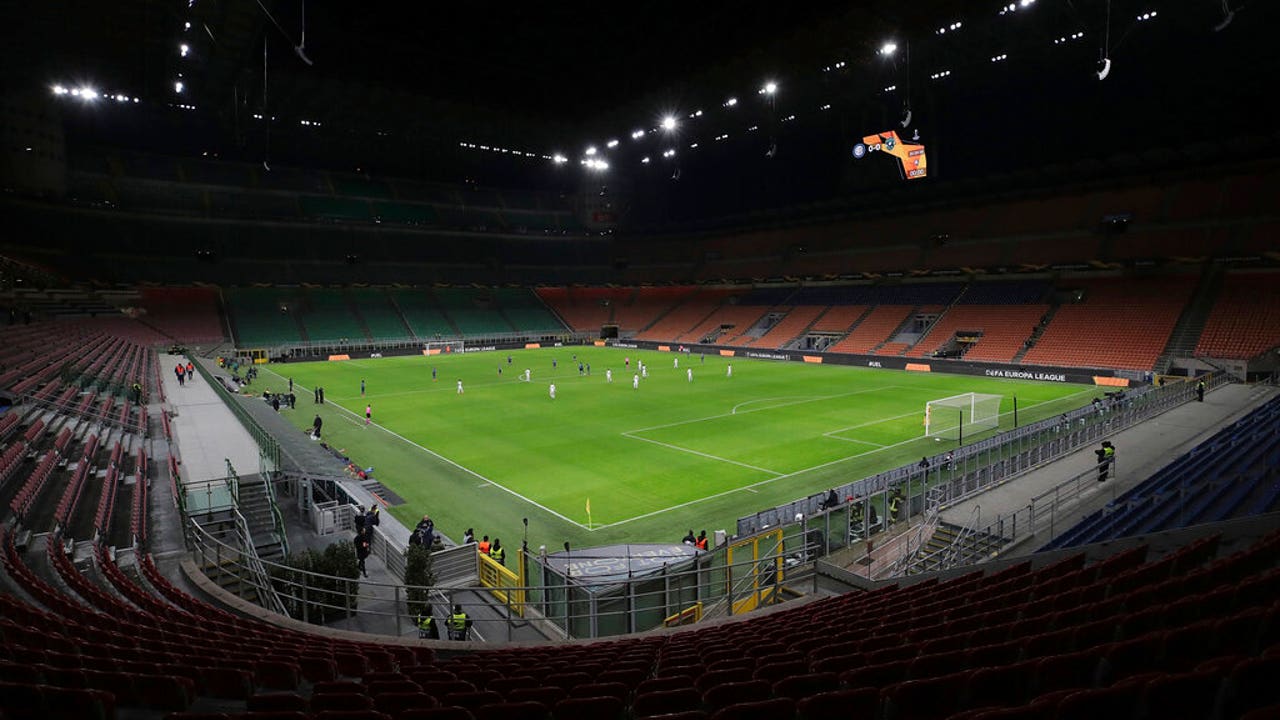 The seats are empty as a precaution against the coronavirus at the San Siro stadium in Milan, Italy, during the Europa League round of 32 second leg soccer match between Inter Milan and Ludogorets. (UEFA via AP)