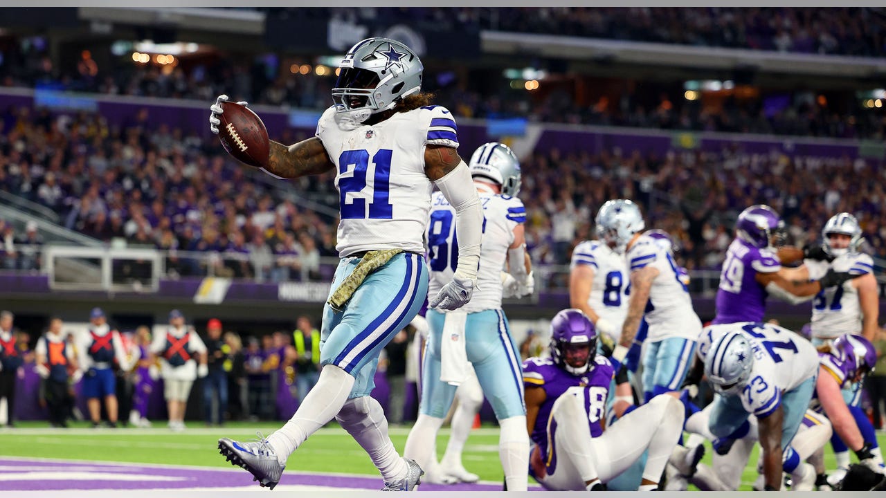 Ezekiel Elliott of the Dallas Cowboys rushes for a touchdown against the Minnesota Vikings during the third quarter at U.S. Bank Stadium on Nov. 20, 2022, in Minneapolis. (Adam Bettcher/Getty Images)