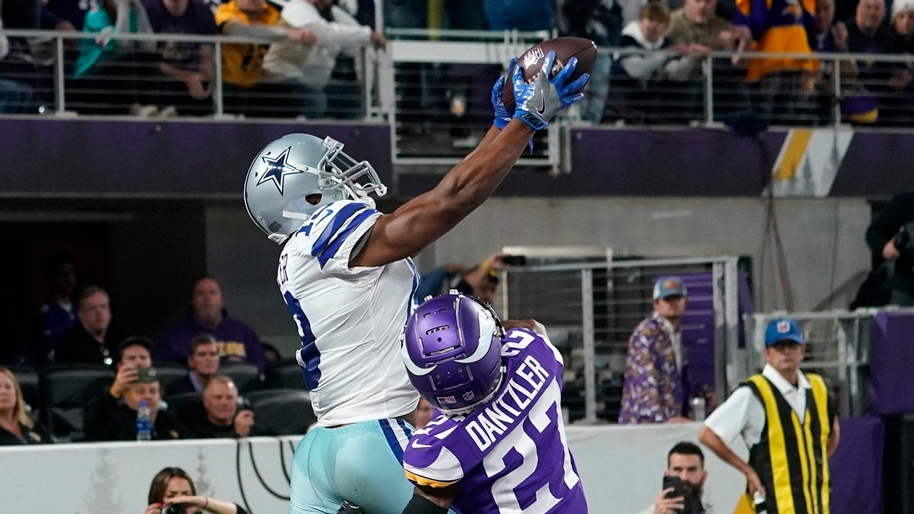 Dallas Cowboys wide receiver Amari Cooper (19) catches a 5-yard touchdown pass over Minnesota Vikings cornerback Cameron Dantzler (27) during the second half of an NFL football game, Sunday, Oct. 31, 2021, in Minneapolis. The Cowboys won 20-16. (AP Photo/Jim Mone)