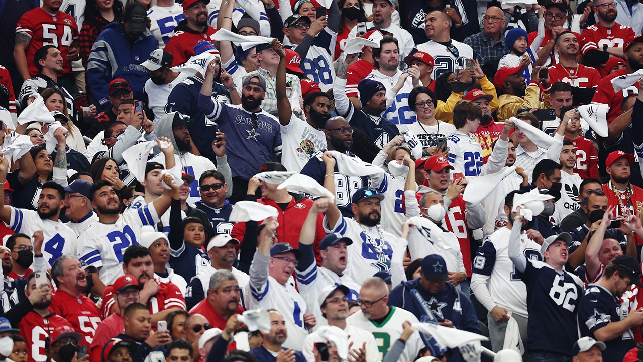 San Francisco 49ers and Dallas Cowboys fans cheer during the first quarter in the NFC Wild Card Playoff game at AT&T Stadium on January 16, 2022 in Arlington, Texas. (Tom Pennington/Getty Images)