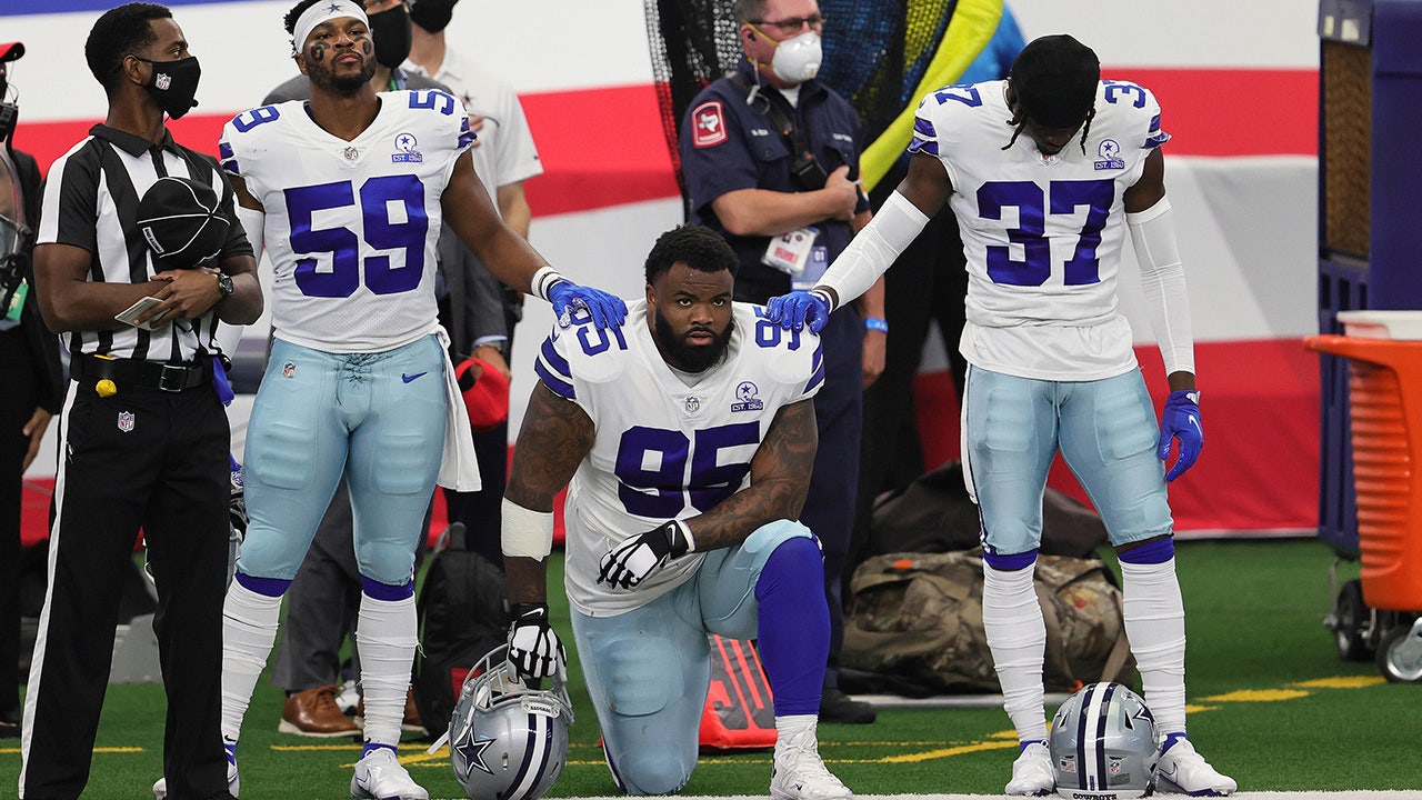 Dallas Cowboys defensive tackle Dontari Poe (95) kneels during the national anthem prior to the game against the Atlanta Falcons at AT&T Stadium. (Matthew Emmons-USA TODAY Sports)