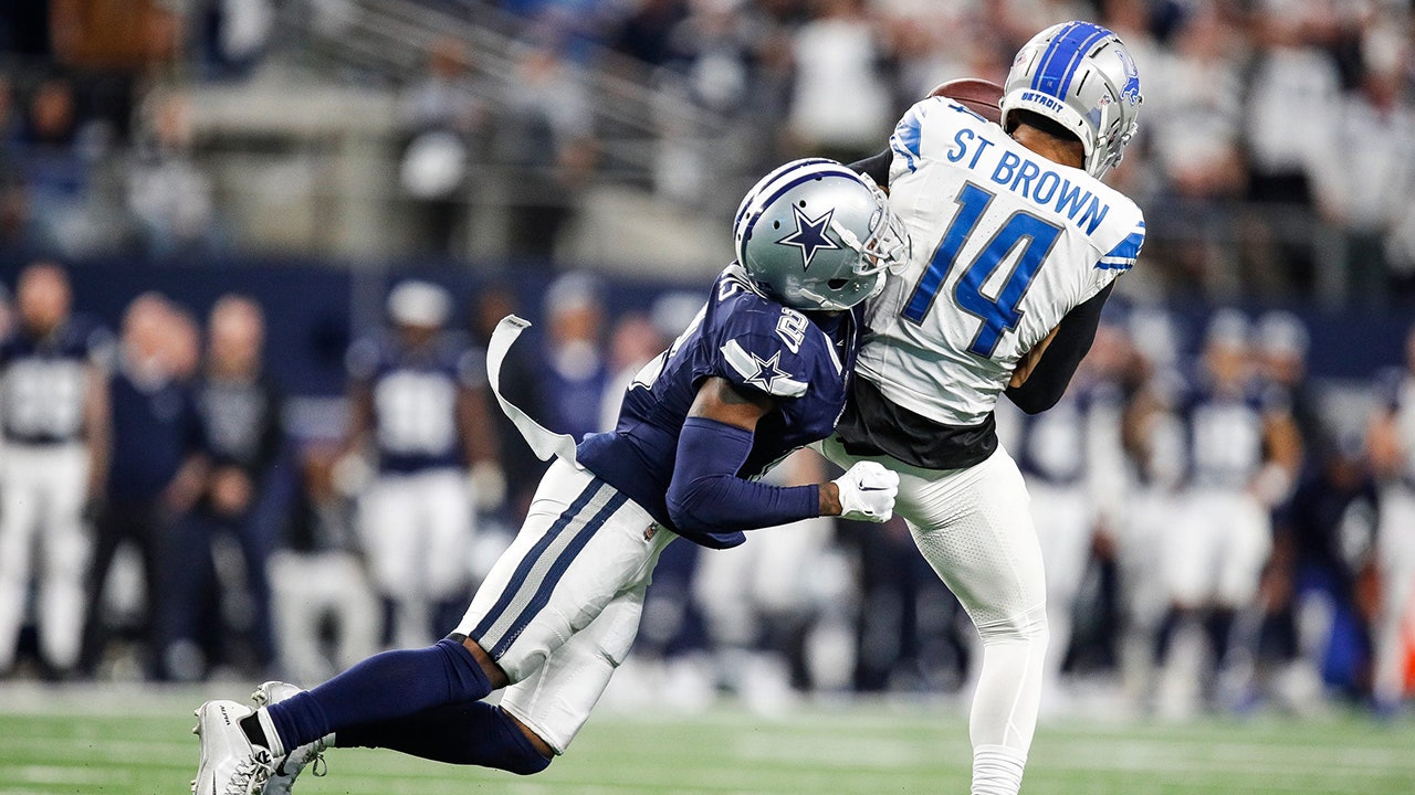 Cowboys cornerback Jourdan Lewis tackles Lions wide receiver Amon-Ra St. Brown at AT&T Stadium in Arlington, Texas, on Dec. 30, 2023. (Junfu Han/USA Today Network)