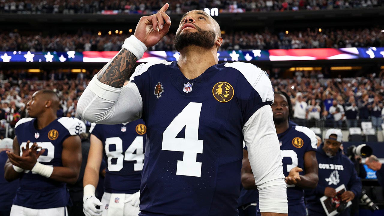 Dak Prescott of the Dallas Cowboys stands on the sideline during the national anthem before a game against the Washington Commanders at AT&T Stadium Nov. 23, 2023, in Arlington, Texas. (Kevin Sabitus/Getty Images)