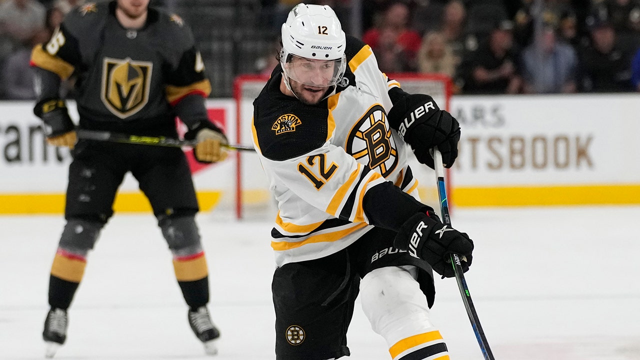 Boston Bruins center Craig Smith (12) shoots to score his third goal against the Vegas Golden Knights during the third period of an NHL hockey game Thursday, March 3, 2022, in Las Vegas. (AP Photo/John Locher)