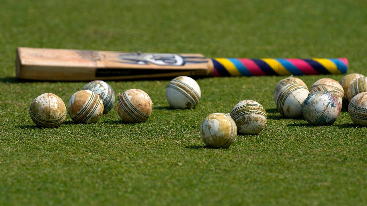 Cricket balls and a bat are seen on the ground before the ICC Men's Cricket World Cup match between New Zealand and South Africa in Pune, India, Nov.1, 2023. (AP Photo/Manish Swarup, File)
