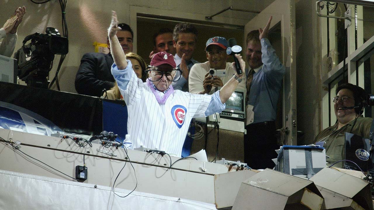 Singer-songwriter Jimmy Buffett, wearing "Harry Caray" glasses, sings "Take Me Out To The Ballgame" during the seventh inning stretch of Game 1 of the National League Championship Series between the Florida Marlins and the Chicago Cubs Oct. 7, 2003, at Wrigley Field in Chicago. (Brian Bahr/Getty Images)