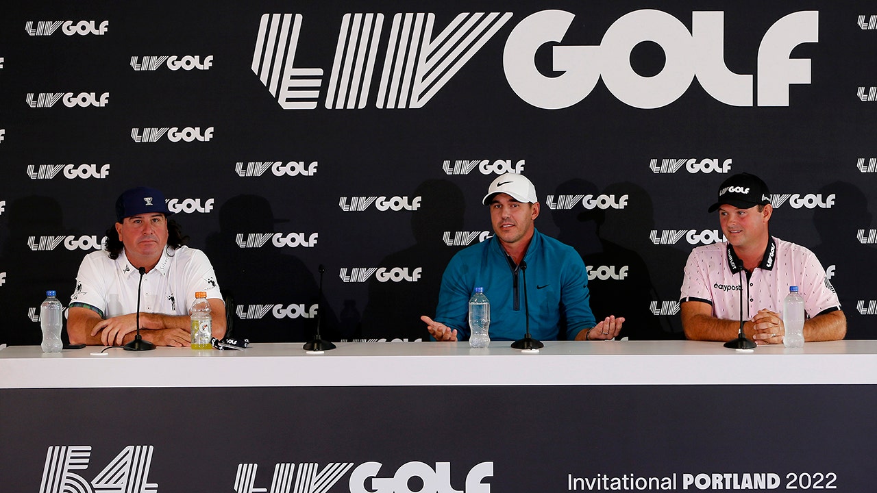 Pat Perez, Brooks Koepka and Patrick Reed speak to the media during a press conference prior to the LIV Golf Invitational — Portland at Pumpkin Ridge Golf Club June 28, 2022, in North Plains, Oregon. (Jonathan Ferrey/LIV Golf via Getty Images)
