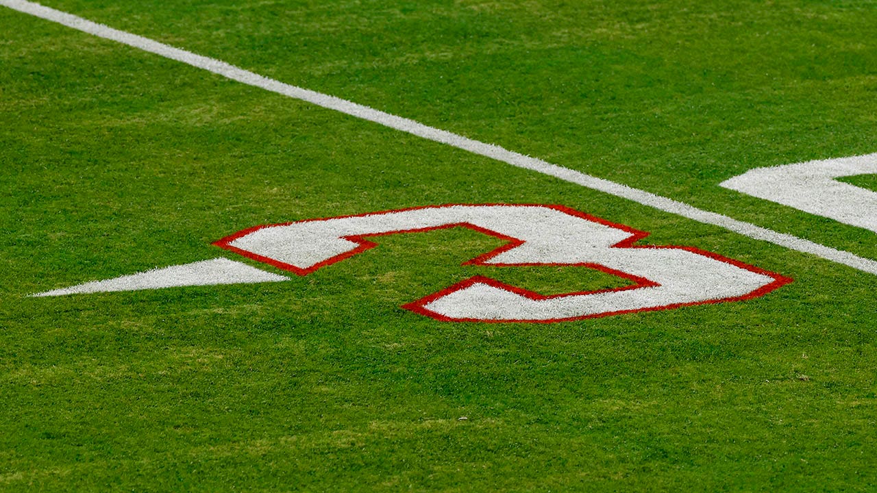 The No. 3. is painted and outlined in red on the field in support of Buffalo Bills safety Damar Hamlin during a game between the Tennessee Titans and the Jacksonville Jaguars Jan. 7, 2023, at TIAA Bank Field in Jacksonville, Fla. (David Rosenblum/Icon Sportswire via Getty Images)