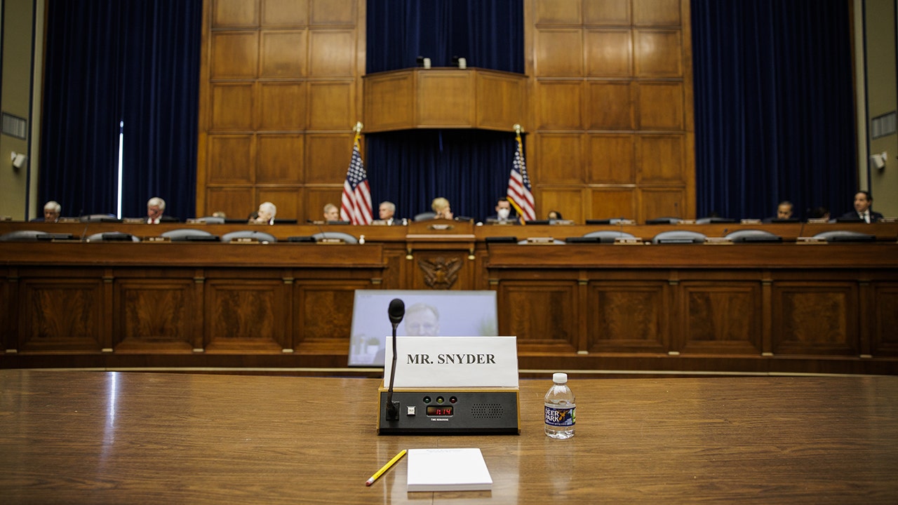 An empty seat marked for Dan Snyder, owner of the Washington Commanders football team, as RogerGoodel, commissioner of the National Football League (NFL), center, speaks via videoconference during a House Oversight and Reform Committee hearing in Washington, D.C., US, on Wednesday, June 22, 2022. (Samuel Corum/Bloomberg via Getty Images)