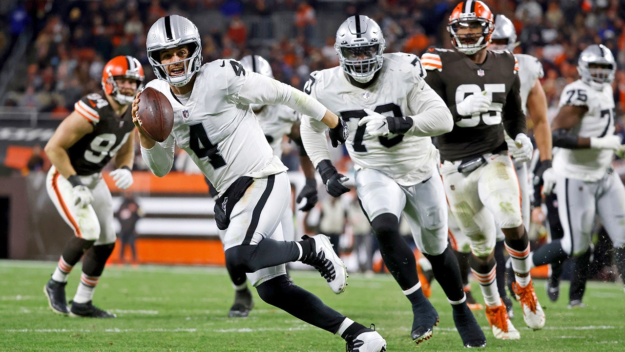 FILE - Las Vegas Raiders quarterback Derek Carr (4) runs with the ball during an NFL football game against the Cleveland Browns on Monday, Dec. 20, 2021, in Cleveland. (AP Photo/Kirk Irwin, File)