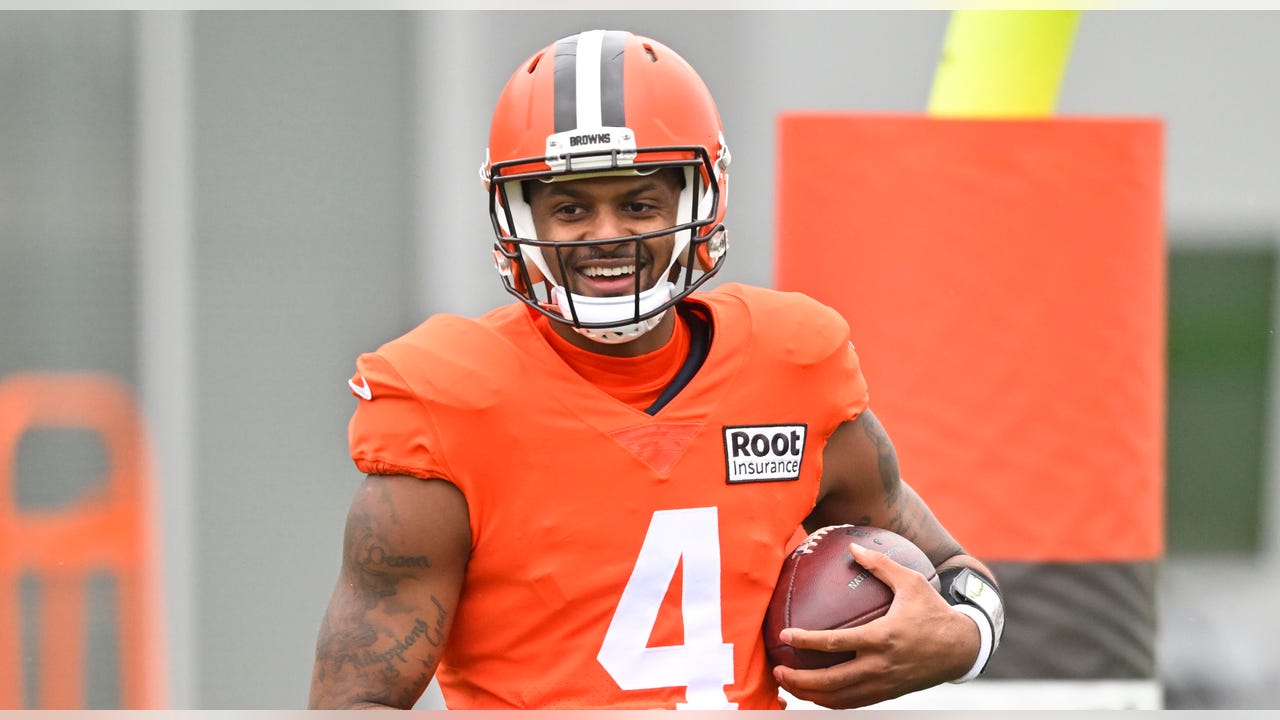 Cleveland Browns quarterback Deshaun Watson was in good spirits as he went through drills during his first regular-season practice on Wednesday in Berea, Ohio.