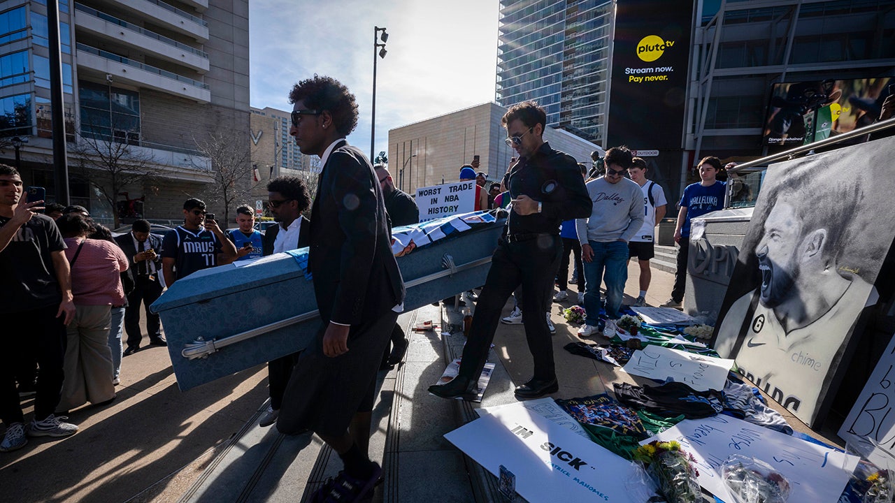 Yes, it was a funeral as several fans, dressed in black suits, carried a blue coffin to the steps in front of the arena, where Doncic shirts, jerseys and more were spread out.