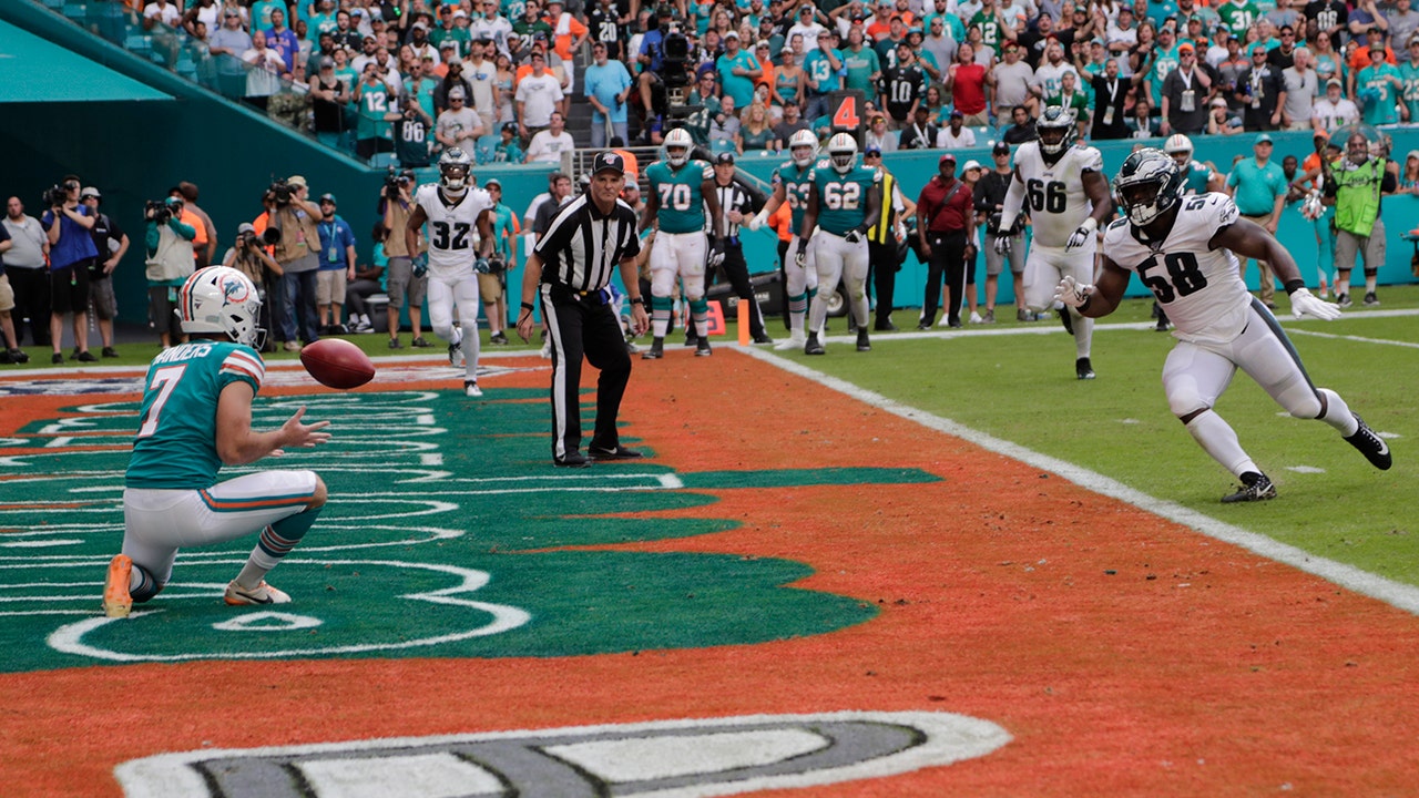 Miami Dolphins kicker Jason Sanders (7) catches a touchdown pass, during the first half at an NFL football game against the Philadelphia Eagles, Sunday, Dec. 1, 2019, in Miami Gardens, Fla. (AP Photo/Lynne Sladky)