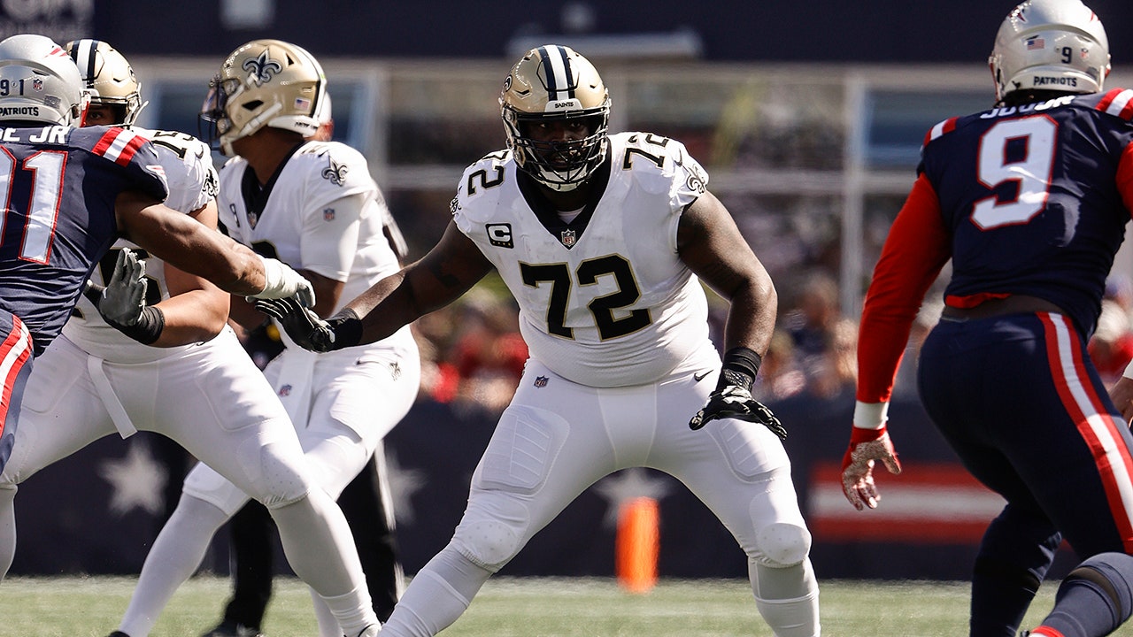 New Orleans Saints offensive tackle Terron Armstead looks to block against the New England Patriots during an NFL football game Sept. 26, 2021, in Foxborough, Mass. (AP Photo/Winslow Townson, File)