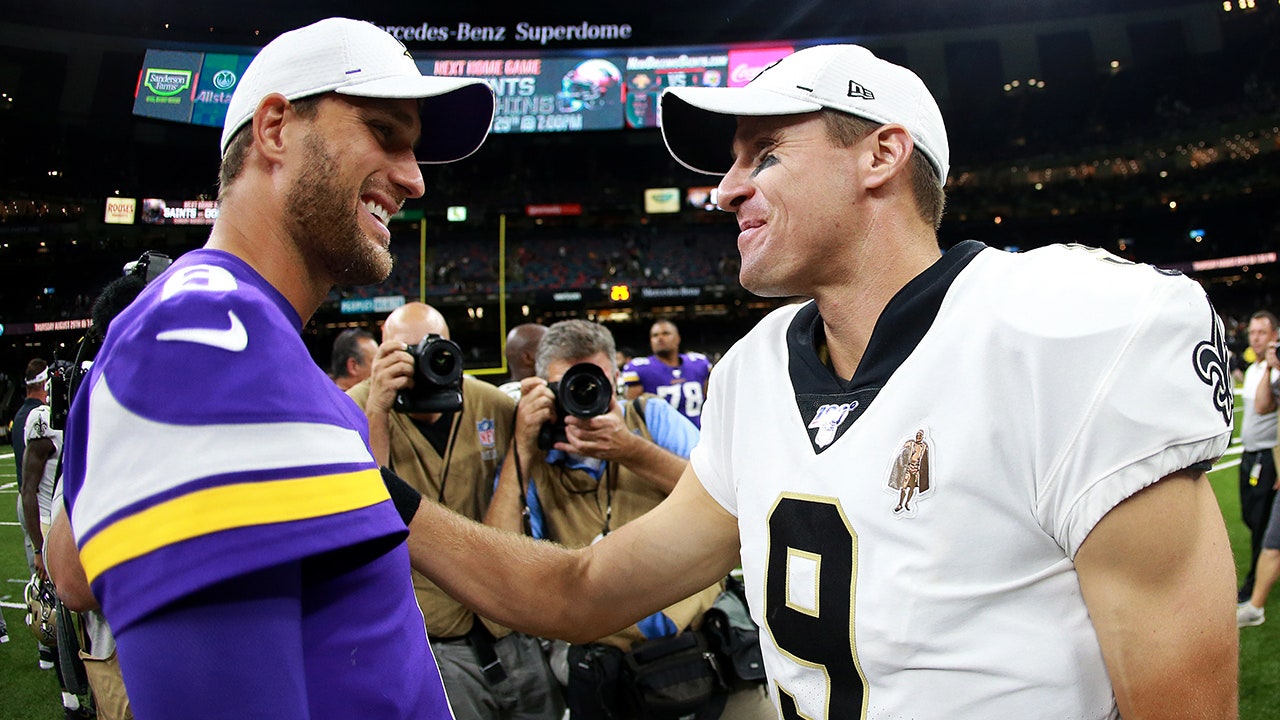 Kirk Cousins, #8 of the Minnesota Vikings, talks with Drew Brees, #9 of the New Orleans Saints, after a preseason game at Mercedes-Benz Superdome on Aug. 9, 2019 in New Orleans. (Sean Gardner/Getty Images)