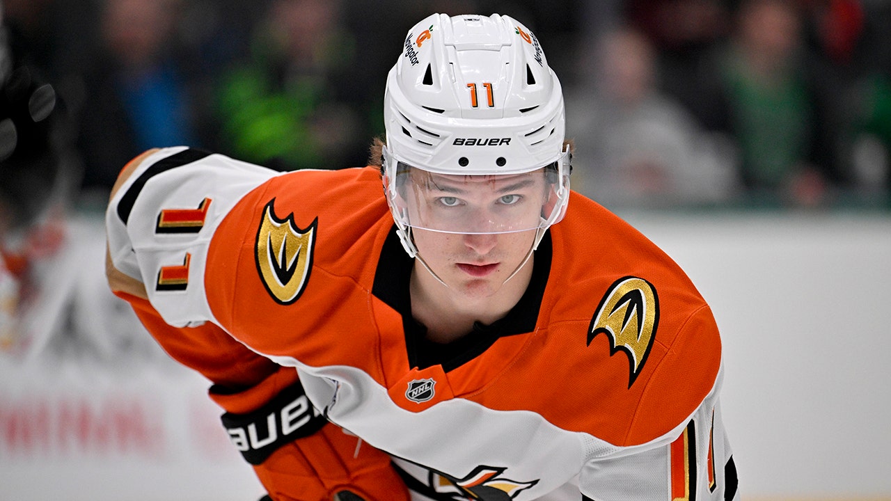 Anaheim Ducks center Trevor Zegras, #11, during the first period against the Dallas Stars at the American Airlines Center in Dallas on March 18, 2025. (Jerome Miron-Imagn Images)