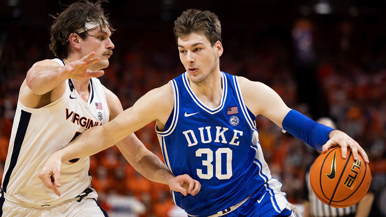 Duke's Kyle Filipowski, #30, defends the ball against Virginia's Ben Vander Plas, #5, during the first half of an NCAA college basketball game in Charlottesville, Virginia, Saturday, Feb. 11, 2023. (AP Photo/Mike Kropf)