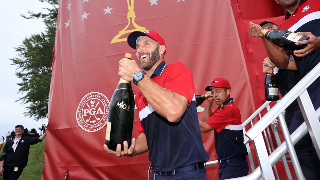 Dustin Johnson of the United States celebrates with champagne after defeating Team Europe during Sunday Singles Matches of the 43rd Ryder Cup at Whistling Straits on September 26, 2021, in Kohler, Wisconsin. (Warren Little/Getty Images)