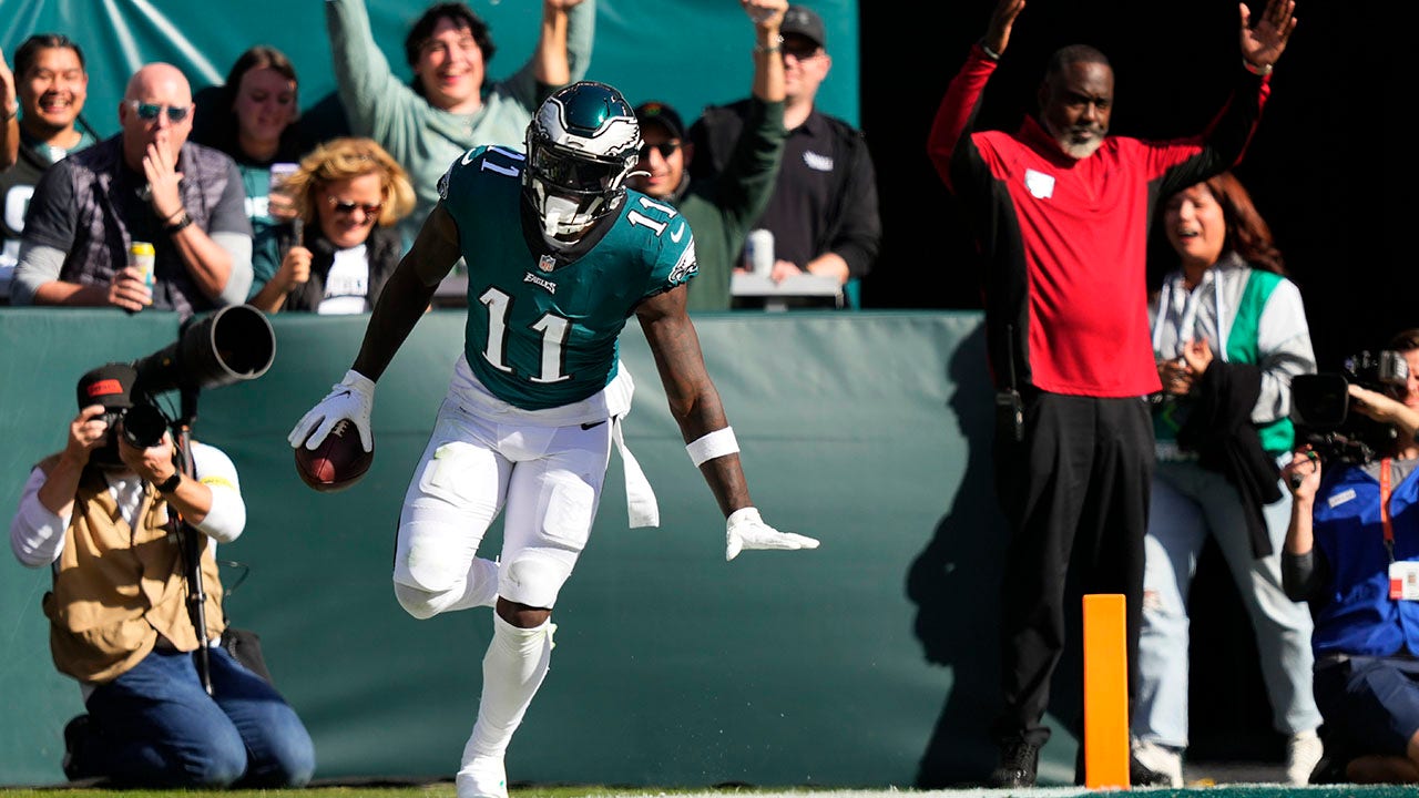 Philadelphia Eagles wide receiver A.J. Brown celebrates a touchdown reception during the first half of a game against the Pittsburgh Steelers Oct. 30, 2022, in Philadelphia. (AP Photo/Matt Slocum)