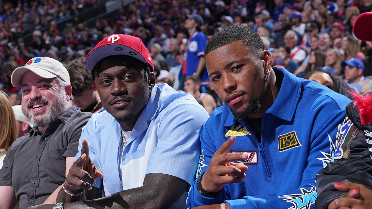 A.J. Brown and Saquon Barkley, right, attend the game between the New York Knicks and the Philadelphia 76ers during Round 1 Game 6 of the 2024 NBA Playoffs on May 2, 2024 at the Wells Fargo Center in Philadelphia. (Jesse D. Garrabrant/NBAE via Getty Images)