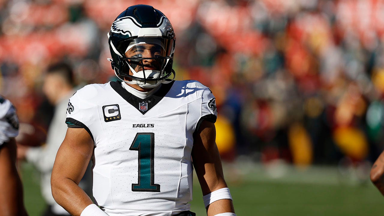 Philadelphia Eagles quarterback Jalen Hurts looks on prior to the game against the Washington Commanders at Northwest Stadium in Landover, Maryland, on Sunday. (Geoff Burke-Imagn Images)