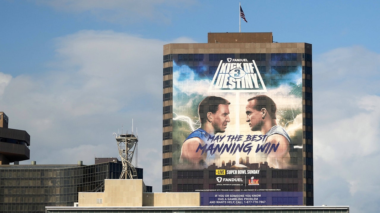 A FanDuel advertisement featuring images of Peyton Manning and Eli Manning on the Entergy building. (Kirby Lee-Imagn Images)