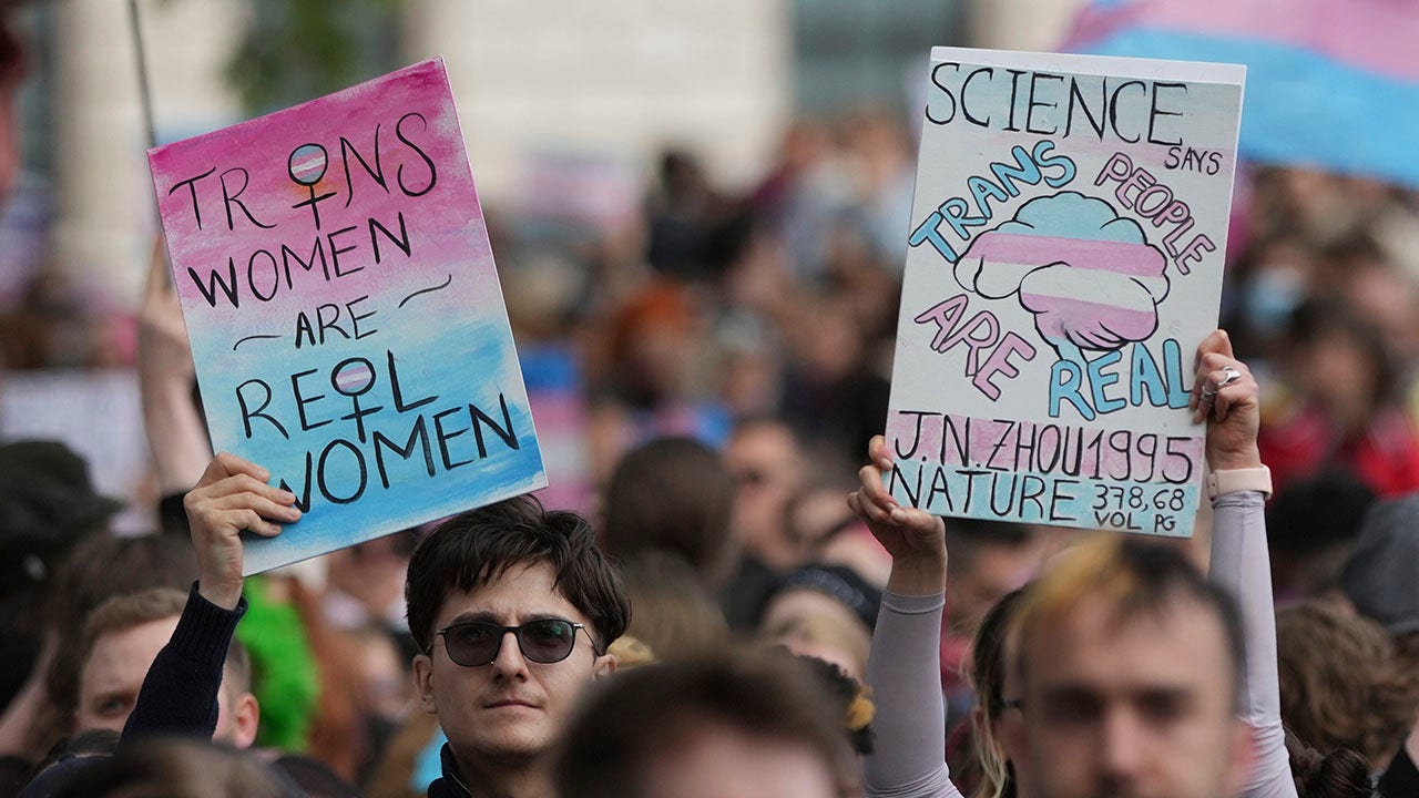 Campaigners take part in a rally organized by trans rights groups, trade unions and community organizations following the Supreme Court ruling on the definition of a woman in equalities law, at Parliament Square in central London on Saturday April 19, 2025. (AP Photo/Alastair Grant, File)