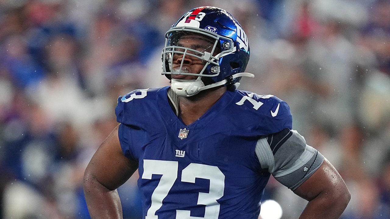 Evan Neal, #73 of the New York Giants, looks on against the Dallas Cowboys at MetLife Stadium on Sept. 10, 2023 in East Rutherford, New Jersey. (Mitchell Leff/Getty Images)
