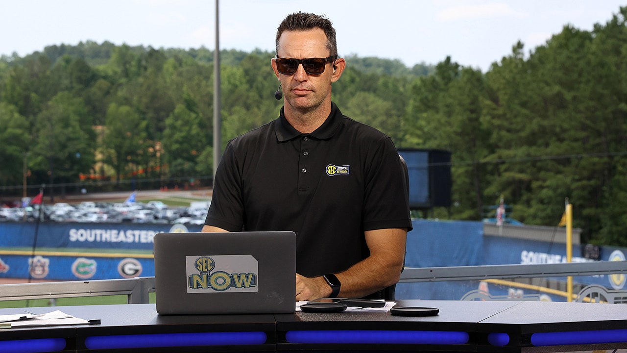 Peter Burns on set during the SEC Baseball Tournament game between the Arkansas Razorbacks and the Texas A&M Aggies on May 27, 2023, at Hoover Metropolitan Stadium in Hoover, Alabama. (Michael Wade/Icon Sportswire via Getty Images)