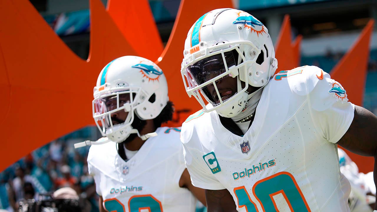 Miami Dolphins wide receiver Tyreek Hill (10) enters the field before a game against the Jacksonville Jaguars Sunday, Sept. 8, 2024, in Miami Gardens, Fla. (AP Photo/Rebecca Blackwell)