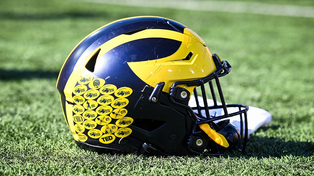 A Michigan football helmet sits on the field after a game against the Indiana Hoosiers Oct. 8, 2022, at Memorial Stadium in Bloomington, Ind. (James Black/Icon Sportswire via Getty Images)