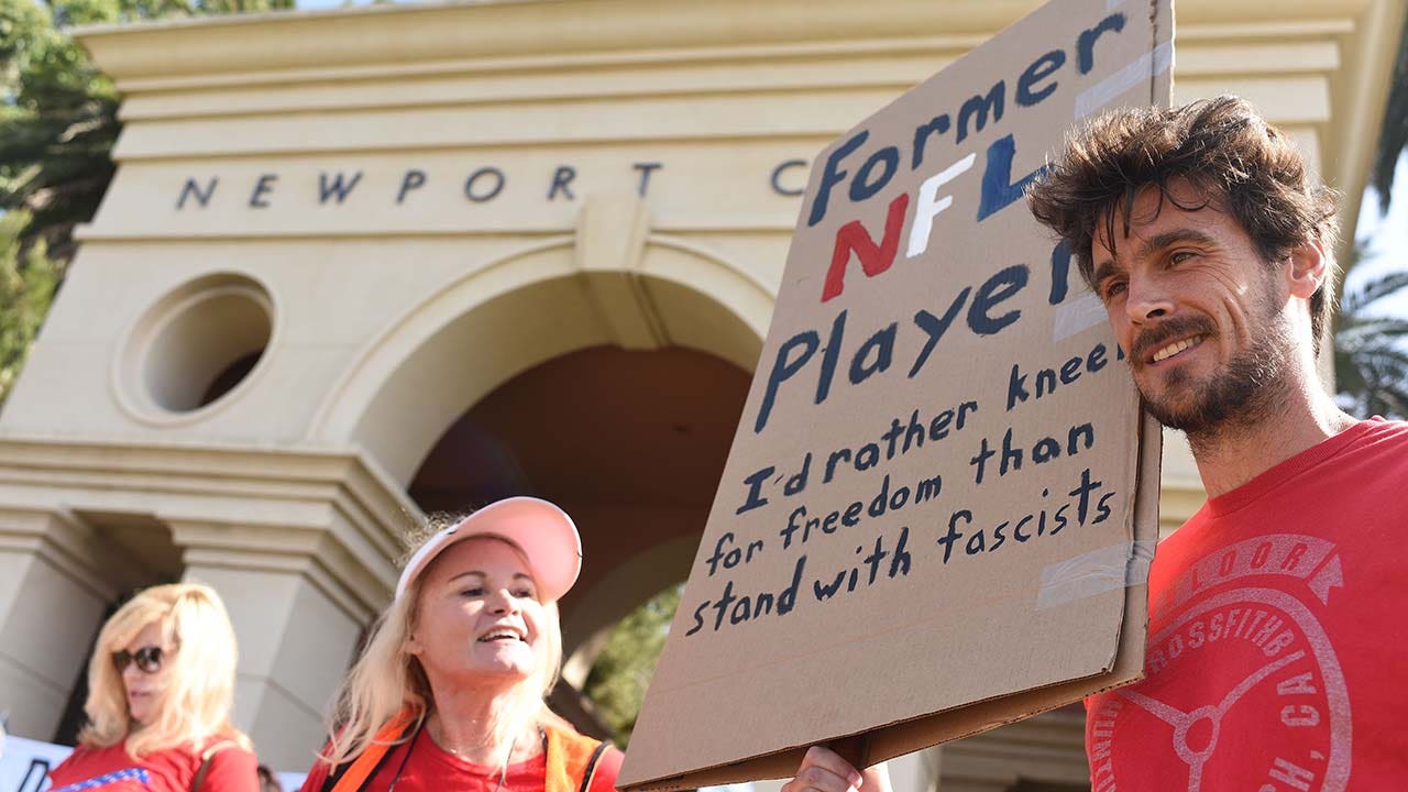 Former Minnesota Vikings NFL player Chris Kluwe joins a small group of protesters outside the Pelican Hill Country Club where then-Vice President Mike Pence is scheduled to attend a luncheon fundraiser, in Newport Beach, California, on Oct. 9, 2017. (ROBYN BECK/AFP via Getty Images)