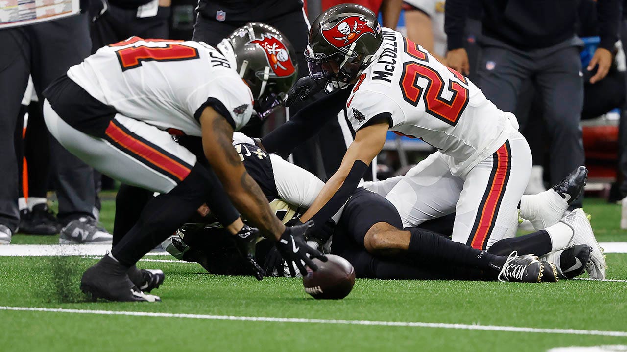 Olave caught a short pass from quarterback Spencer Rattler, who was starting in the first game of his NFL career in place of Derek Carr. He was met by defensive backs Zyon McCollum and Tykee Smith. As the defenders made the play on Olave, the wide receiver coughed up the ball.