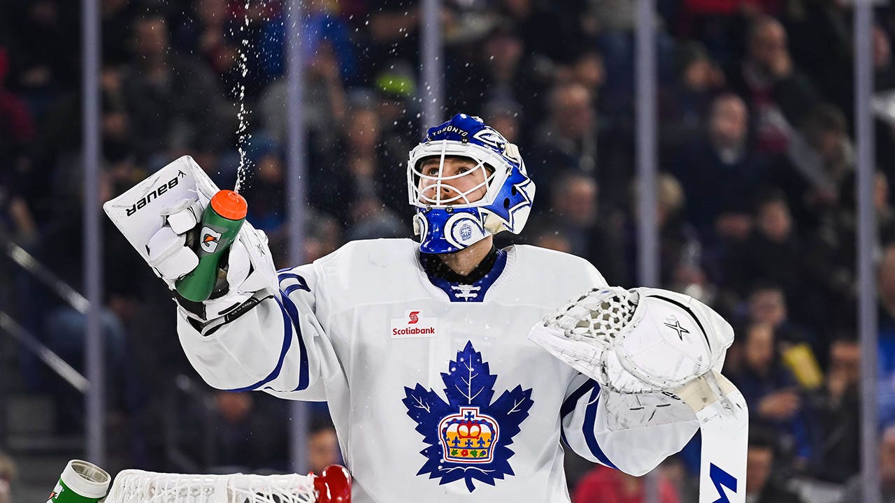 Toronto Marlies goalie Kasimir Kaskisuo (30) squirts water in the air during the Toronto Marlies versus the Laval Rocket game on December 28, 2019, at Place Bell in Laval, QC. (David Kirouac/Icon Sportswire via Getty Images)