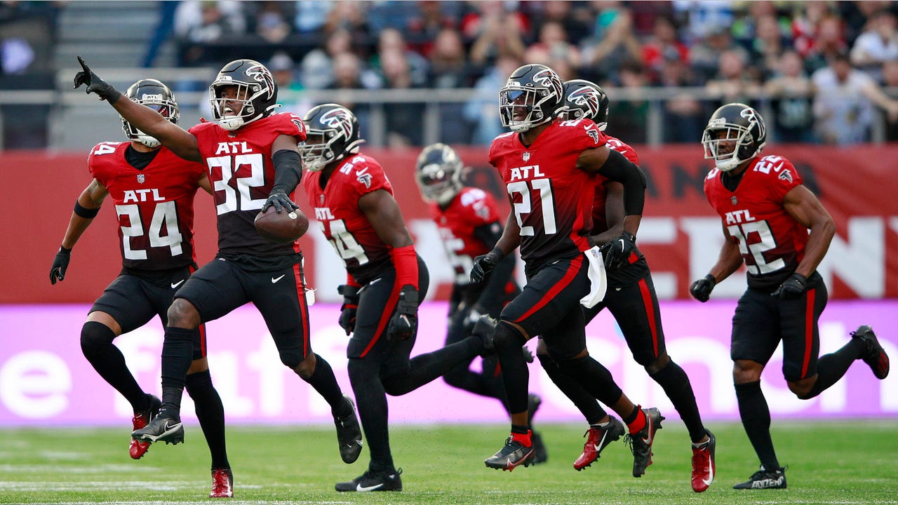 Atlanta Falcons safety Jaylinn Hawkins (32) celebrates making an interception during the first half of an NFL football game between the New York Jets and the Atlanta Falcons at the Tottenham Hotspur stadium in London, England, Sunday, Oct. 10, 2021. (AP Photo/Ian Walton)