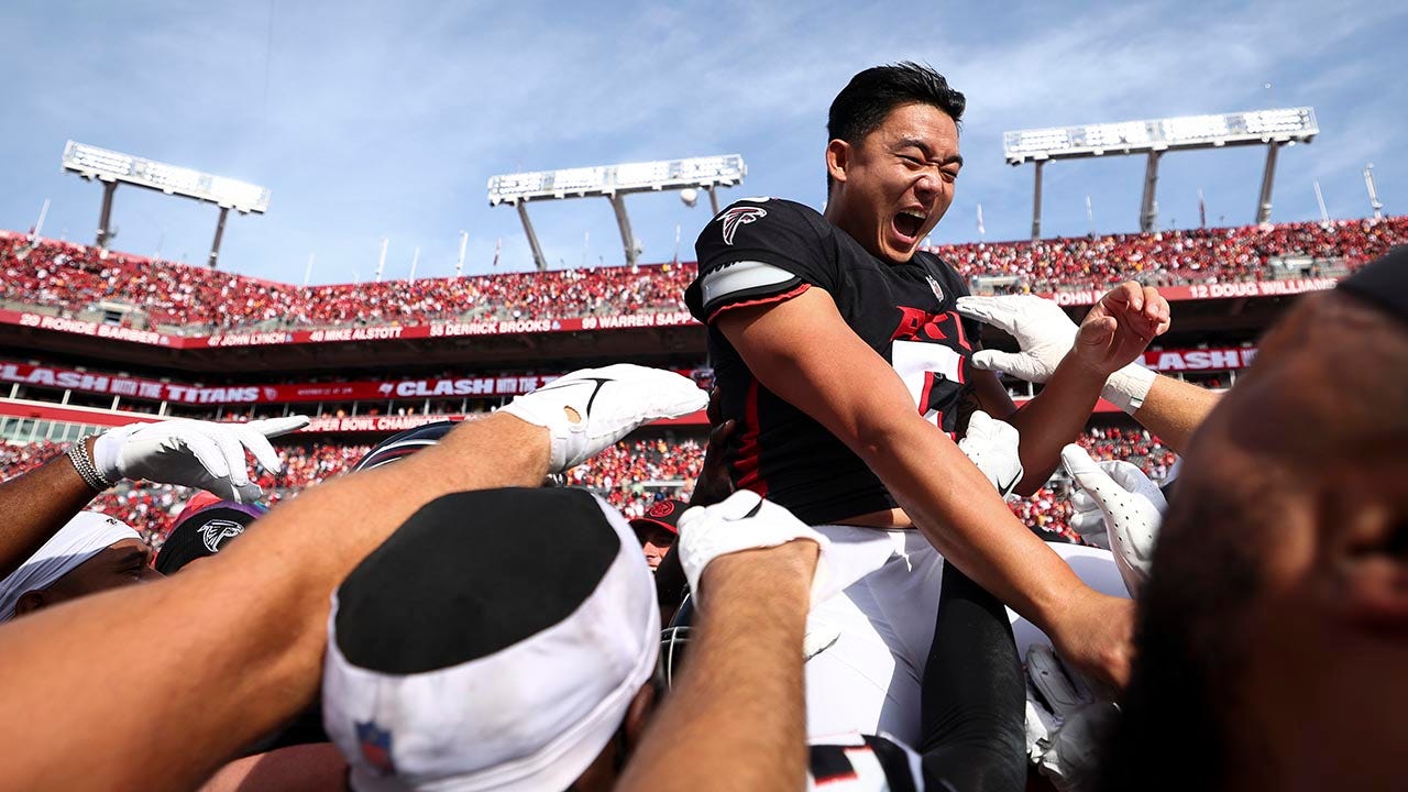 Younghoe Koo of the Atlanta Falcons celebrates with teammates after kicking a game-winning field goal on the final play against the Tampa Bay Buccaneers at Raymond James Stadium on October 22, 2023, in Tampa, Florida. (Kevin Sabitus/Getty Images)