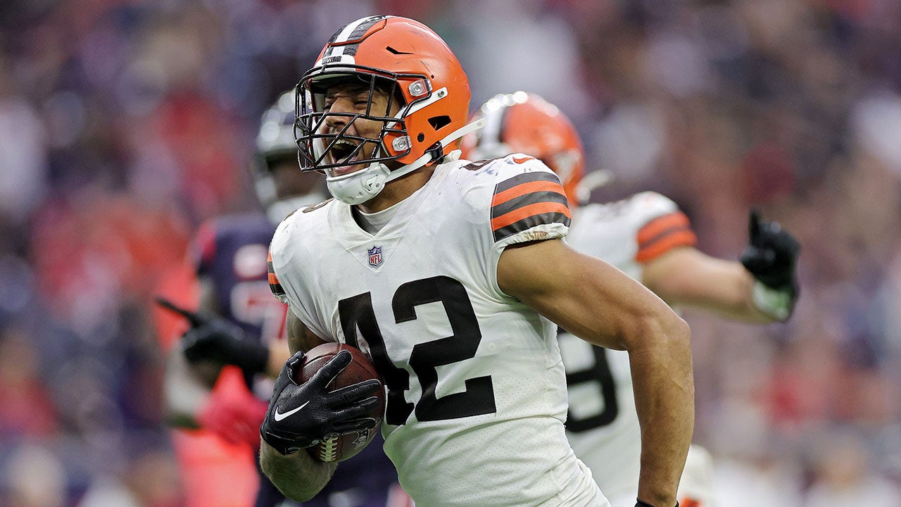 Tony Fields II #42 of the Cleveland Browns reacts while returning an interception for a touchdown during the fourth quarter against the Houston Texans at NRG Stadium on Dec. 4, 2022 in Houston, Texas. (Carmen Mandato/Getty Images)